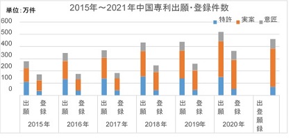 図 1:2015 年~2021 年中国専利出願・登録件数