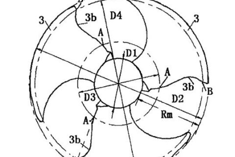 ブレードの後縁のくぼみ終了位置Bが円周に位置する直径をD4としたときに、(D4-D1)/2=(0.8~1.0)Rmである